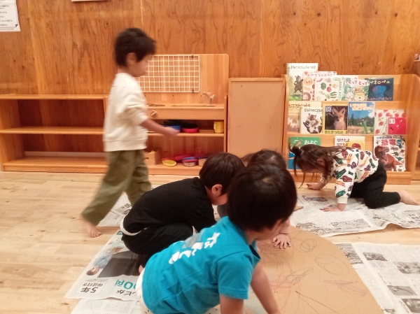 ボール紙の大きなクジラにクレヨンでお絵かきしました!