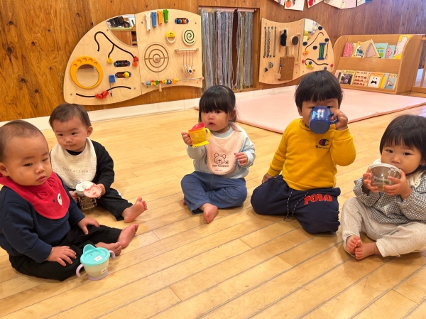 お茶を飲む時にみんなでコップをコツンとぶつけ合い乾杯をしながら飲んでいます♪時には先生も仲間に入れてくれますっ!